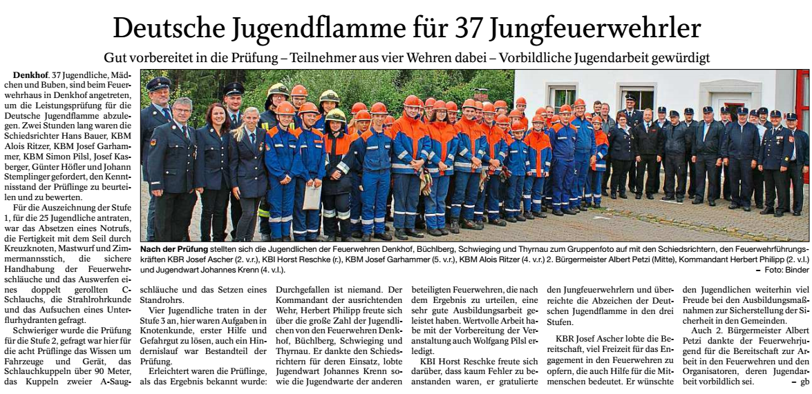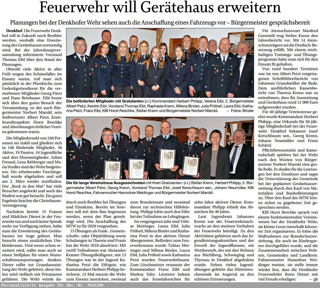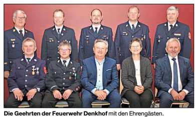 Für ihren Dienst am Nächsten wurden vom Bayerischen Innenminister Joachim Herrmann fünf Feuerwehrleute aus der FF Denkhof mit dem Feuerwehr-Ehrenzeichen in Gold ausgezeichnet. Landrat Franz Meyer überreichte persönlich die Urkunden für diesen 40 Jahre währenden Einsatz. Bürgermeister Norbert Marold bezeichnete die Fünf und ihre Feuerwehrkameradinnen und Kameraden ganz allgemein anerkennend als „Menschen, die für uns durchs Feuer gehen“.