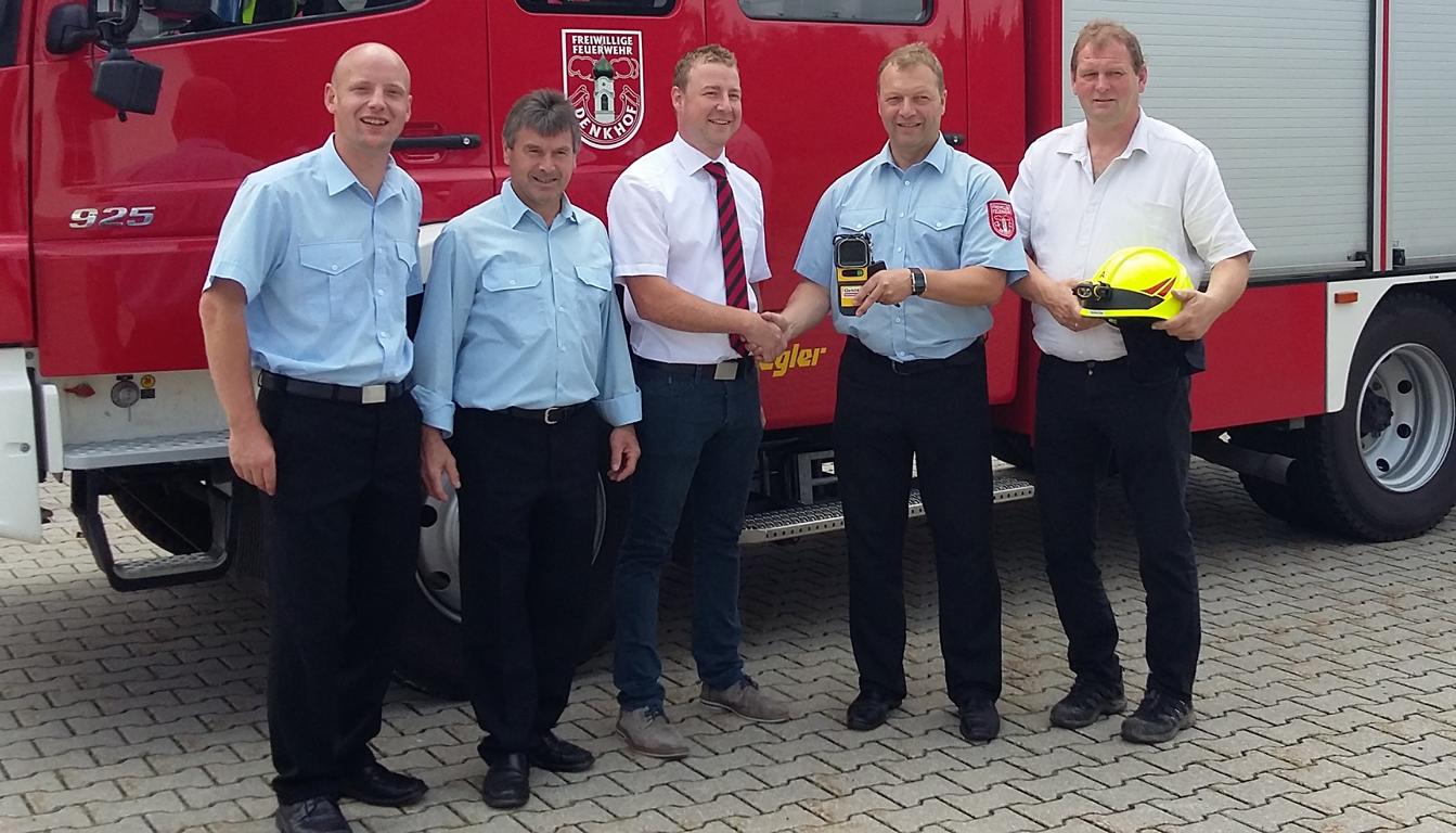 Von links: Stefan Krenn 2.Kdt, Herbert Philipp 1.Kdt, Franz Eibl Fa. Gstöttl, Thomas Eibl 1.Vst, Albert Petzi stellv. Bürgermeister